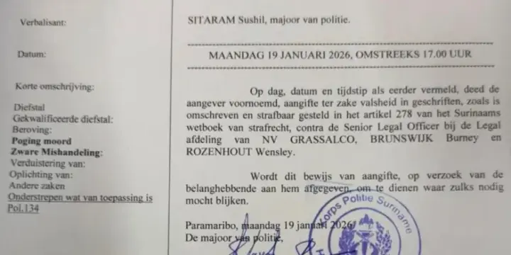 Uit documenten waarover de redactie beschikt blijkt dat er op 19 januari 2026 daadwerkelijk aangifte is gedaan bij het Korps Politie Suriname. Volgens het bewijs van aangifte, opgemaakt door bureau Herman E. Gooding, heeft president-commissaris Berto Sampli aangifte gedaan wegens valsheid in geschrifte, strafbaar gesteld in artikel 278 van het Surinaams Wetboek van Strafrecht.